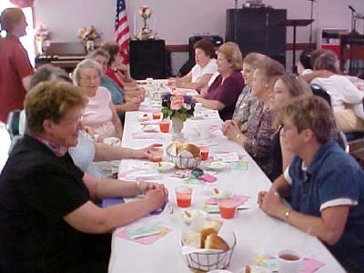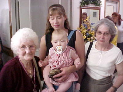![]() L to R: Lucy Marks, Sarah Marks (granddaughter) holding great-great granddaughter Kaitlyn Marks, Wandalea McCumbers (daughter) The oldest mother present at the Mother and Daughter Tea held yesterday evening in Grantsville was Lucy Marks, age 89. Present with Lucy was her 100th grandchild, actually great-great grandchild, Kaitlyn Marks. Lucy Marks is the well-known West Fork clogger, and mother of twelve children. CCCOA Assistant Director Brenda McBride welcomed the mothers, daughters and granddaughters to the annual Mother and Daughter Tea, held yesterday evening at Grantsville's senior center. A special guest speaker for the evening was Sue Jones. The mother present with the most children was Opal Vandale - fifteen in number.