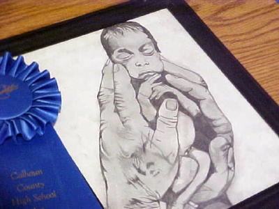 ... and Tyson Price's ceramic head Other winners are Chris Sampson, Kevin Yeager, Hanna Law, David Dodd, Susan Sullivan, Erica Wriston, Teresa Bell, Christy Thomas, Jade Nichols, Jacob Richards, Tim Butler, Jacob McCumbers, Natasha Shock, Lauren Randell-Myers, Michael Jenkins, Ryan Jarvis, Brandon Gainer, Todd Ferrell, Richard Mace, Kim Self, Joey Justice, Rebecca Hannah, Tabitha Scott. The student's Art Show is on display in the commons area of Calhoun Middle-High School through Saturday. More to follow ... |