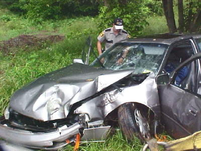 It was a same spot, different day accident on Hog Knob Hill yesterday as a car spun out of control on rain-slick Route 5 and crashed into several trees, sending the driver and a infant passenger to Minnie Hamilton Health Care Center. Sources at the scene indicated the driver did not appear to be seriously injured, and the infant escaped injury being secured in a car seat. The car appeared to be a total loss. The Toyota was traveling west, coming down Hog Knob Hill on the Grantsville side. A light rain shower had just covered the area. The area has been the site of numerous accidents in recent years, usually a mix of rain and oil that appears to seep through the asphalt. The auto in yesterday's accident struck "The same usual trees," said Chief Deputy Carl Ballengee. "The car landed in the frequent spot." Calhoun EMS, the Grantsville VFD and the Calhoun Sheriff's Department responded to the accident about noon.
