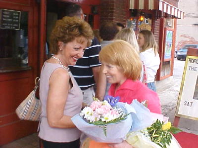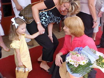 Judy Miller greets young Abby Nichols and her mother Jennifer