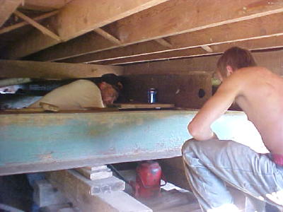 ![]() Workers labor over raising Hays-Knotts house above flood plain
