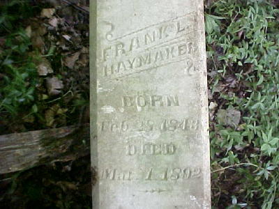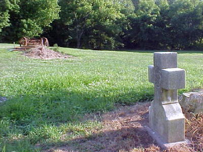 William Campbell and wife buried inside fenced area The Louisa Chapel Church, directly across the road from the Hays-Knotts home, was built about 1889 and named for George Hays' grandmother, wife of Peregrine. Clyde Knotts is an active member in the church, and has helped with its renovation. George Hays (1881-1936) married Myrtle Reading and not unlike his father and grandfather was a stalwart citizen of Arnoldsburg, engaging in farming, road building and owning the first service station, selling Overland and Chevy cars. He also operated a bus line between Spencer and Glenville. George represented Calhoun in the state legislature in the 1920s before his untimely death of a heart attack. He was the father of well-known residents Bernard, now deceased, and George Roessing Hays is 92, living in Florida. "Do you know there are three Hay's graveyards real close, plus the folks who are buried under and beside the Louisa Chapel church?" asked Knotts. We went to visit them. At least three graves are under the church, marked with flag stones, and two graves in the yard. One grave belongs to clergyman and Confederate soldier, Elim Mitchell, who was killed at Arnoldsburg. Another may be a Union soldier who died at the Arnoldsburg Skirmish and the others are likely black slaves owned by the Hays family. Buried in the backyard of the Hays-Knotts house is the single grave of Amie Eva Sexton Silcott (1836-1865), wife of the county's first clerk George W. Silcott, who moved to Grantsville and was buried years later in the Bethlehem Cemetery. "It seemed sorta strange to look out the back door and see her monument," said Knotts. "But we got use to it." Clyde, Esther Laughlin and I trekked up the steep hillside across the road from the old Arnoldsburg motel (US 33-119) to the abandoned Hays Cemetery, which has grown up with brush, green briers and weeds, with most of the monuments down. Some graves are marked with flagstones. G. Warren and Mary Roessing Hays, he the son of Peregrine, are buried there, along with his son Perry B. and his wife Rosa Stump, who both died young, among other Hays relatives. In a designated part of the cemetery, enclosed by a steel posted fence, lies the bodies of William H. Campell and his wife Nancy, both likely passing before 1900. The Hays-Haymaker cemetery is just downstream from Arnoldsburg. George Hays is buried there. Clyde Knotts said his family enjoys living where the Calhoun old-timers first came, fought the fights over the establishment of the county, went to the Civil War and worked hard for their families and community. Note: Clyde Knotts is now deceased. |