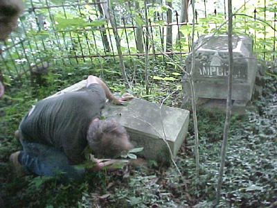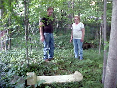 Clyde Knotts and Esther Laughlin examine abandon hillside graveyard