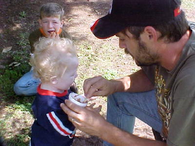 Basil and "Bubby" Brown tune up for afternoon gospel music The annual Cremo Homecoming "held its own" last Sunday with most of the familiar faces coming home to enjoy "dinner on the ground" plus an afternoon of gospel music and preaching. Notable at the homecoming is the long table with a spread of food that won't quit. Cremo was named for a cigar, and was the location of an early Calhoun post office, the Duskey Store and lodge hall, the old building is still standing. The Cremo Community Church has been given a face lift and resurrection in recent years.
