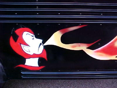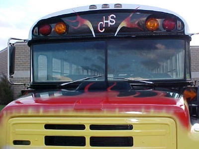 Band Director Harry Beall (left) receives bus from Butch Ford (right), The Calhoun Middle-High School Red Devil Band has a bright and shiny new bus, at least the paint job. Butch Ford's Auto Body at Grantsville has taken the dull and drab old school bus and made it a "looker" for the school band. He did it for free, too. The Band Boosters are expressing their appreciation to Butch Ford for his excellent work. The local band is slated for participation in several regional events.
