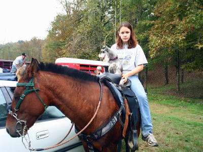 | Submitted by Bernaetta Shamblin Amy Shamblin of Stumptown and Jennifer Minney of Rosedale competed in a Horse Show last Saturday, at Holly Gray Park in Braxton County. The barrel race competition was exciting, but Amy's horse-riding Schnauzer, stole the show in the "cute," category.