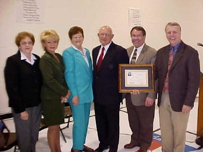 Award Presentation (L to R) Board members Joy Starcher, Cynthia Dale, Carlene Frederick, Dr. David Stewart, state superintendent (presenter), Ron Blankenship, county superintendent and Larry Stinn, school principal It was celebration day at Pleasant Hill School yesterday and principal Larry Stinn and the school's teachers were beaming with pride. The school was recognized for high achievement by the West Virginia Board of Education and and the Department of Education, part of a statewide West Virginia Achieves Recognition Tour. The school not only met what educator's call Average Yearly Progress, but it proved "best among peers" and achieved "above and beyond." County Superintendent of Schools Ron Blankenship said 40% of the Pleasant Hill students scored "above mastery," reaching distinguished levels in reading and math.