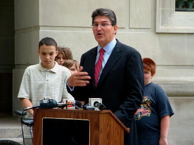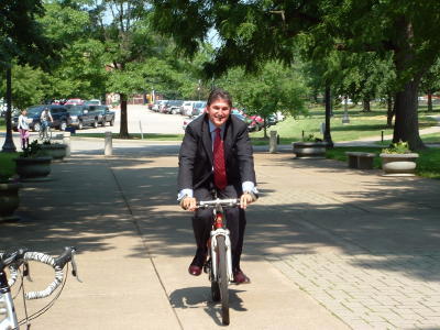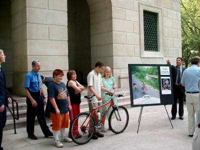 ![]() Matt Marcus, WVMBA President with Gov. Manchin Governor Manchin then jumped on a mountain bike for a little spin, and in true mountain bike style, rode up the steps, prompting one aide to mutter "I am so glad he didn't crash!"
