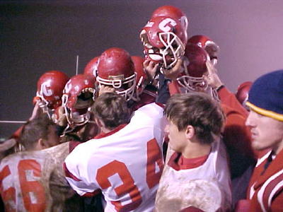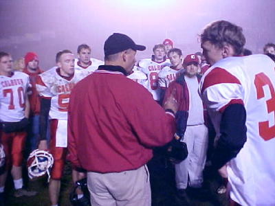 On a night when a cold, dense fog made the second half of the game surreal, Calhoun played without three starters and had an opponent keep Paul Goodrich out of the end zone for the first time this season. Still the Red Devils won. And won easily, 35-0 over Braxton. While Goodrich did not score he was a major factor in the Calhoun offense, as a decoy if nothing else. Wherever the Kennedy Award candidate went he drew an inordinate amount of attention from the Eagles' defense. And while the Eagles were dogging Goodrich the rest of the Red Devils were running wild (and usually open) against Braxton. Jason Cunningham scored twice for the Red Devils. Once on a nine-yard reverse from his flanker position and once with a 65-yard pass interception. Matt Houchin scored on a 44-yard run, Jeff Goodrich scored on a two-yard run and Tyler Shartiger caught a 34-yard touchdown pass from Paul Goodrich on the halfback option. Calhoun played without three senior starters. Tight end/defensive back Steven Cunningham and two-way tackle Justin Whipkey were sidelined with leg fractures while fullback/linebacker Chad Conley was sidelined with a knee injury. But the people filling in for them performed well. And Paul Goodrich was a big reason why. On Calhoun's first scoring drive Braxton keyed on Paul Goodrich. This, however, allowed Jeff Goodrich, starting at fullback in place of Conley, had huge holes on a couple of quick openers up the middle as the Eagles chased Paul Goodrich to the outside. Jeff Goodrich's touchdown came up the middle. The next time Calhoun got the ball Paul Goodrich rolled to the right taking most of the Braxton defense with him and Jason Cunningham was able to take the reverse and race past the startled Eagles for the score. Calhoun scored the next time it got the ball when Houchin faked the toss to Paul Goodrich, tucked it in instead and rambled 44 yards for the score. Those three quick touchdowns gave Calhoun a 21-0 first quarter lead against the 2-8 Class AA Eagles. The next time Calhoun got the ball Braxton completely bit on what appeared to be a Paul Goodrich sweep only to have the senior tailback hold up and fired a strike to Shartiger, who grabbed the ball and rambled into the end zone. But after that score at 10:21 of the second quarter Calhoun's offense failed to click again. Despite getting first downs and despite Paul Goodrich punishing the Eagles defense (he ended the game with 192 yards on 29 carries) Calhoun failed to score. But the Red Devils probably were their own worst enemy as they had a succession of drive-killing penalties. Overall Calhoun had nine penalties for 55 yards. Braxton, on the other hand, was penalized twice. The only scoring in the second half came when Jason Cunningham stepped in front of a Braxton pass and hauled it back 65 yards for the score. That play came in a fog so dense that the PA announcer, after the play, said "Jason Cunningham scored ... I think." With the Eagles going all out to stop Paul Goodrich, Jeff Goodrich and Houchin had two of the best rushing performances of their career. Jeff Goodrich had 61 yards on nine carries while Houchin added 57 yards on six carries. Overall Calhoun had 384 yards total offense (307 rushing) and 24 first downs. The Red Devils' defense was, once again, rock-ribbed allowing Braxton just 68 yards total offense and five first downs. With the win the 7th-ranked Red Devils raised their record to 8-1 setting up a mammoth game against 8-1 St. Marys this coming Friday at Mount Zion. Should the Red Devils beat St. Marys they should finish in the top four in the state and be able to host two playoffs games (should they win the first one) and maybe a third depending on how other playoff games go. |