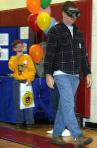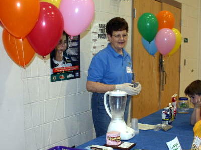 Carlene Frederick (top) demonstrates snuff ingredients, Carlene Frederick's booth demonstrated the ingredients in snuff. Joyce Morgan, school health nurse's booth dealt with nutrition - she showed the fat and sugar content of common foods. Calhoun County School's booth displayed the consequences of using alcohol, drugs or tobacco on school property along with demonstrating the effects of alcohol using "Drunk Goggles." Drunk goggles are used in drunk driving prevention and awareness programs. They simulate the effects of impairment, including reduced alertness, slowed reaction time, confusion, visual distortion, alteration of depth and distance perception, reduction of peripheral vision, poor judgment and decision making, double vision, and lack of muscular coordination.
