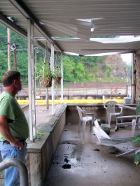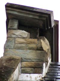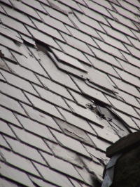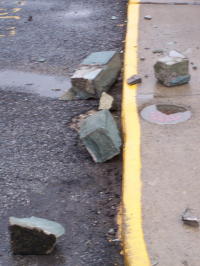 Risk posed for traffic and pedestrians on back street (L) with Grantsville residents saw the flash and heard the strike. Pieces of the chimney fell to the street behind the courthouse and rolled down the roof, crashing through an aluminum porch awning. Pieces of the original slate roofing shingles were also damaged on the historic building. County commission president Rick Sampson said he hopes shingles matching the original ones can be found. |