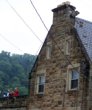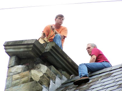 Other volunteers, left to right, Kevin Helmick, Eddie Harris, Craig Gherke and Richard Kirby prepare to lower the stone from courthouse annex Volunteers took care of a safety problem on the courthouse annex yesterday. Lightning struck the old jail building's chimney Tuesday night, dislodging a number of cut stones, which fell to the ground and through an aluminum porch cover. At least one large cut stone was precariously hanging on the chimney's edge, and workers tied a rope about the stone to lower it to the ground. While the heavy stone was being lowered, the rope broke and the stone fell through the already damaged porch cover.