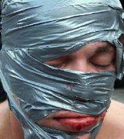 Twenty-four year old Kasey G. Kazee, entered Shamrock Liquors with his entire head wrapped, mummy-style, with the multi-purpose adhesive tape. They say Duct Tape has thousands of uses. Even in fashion, hats, purses, wallets, belts, book bags, guitar strings and other accessories are being made with the tape, which now comes in dozens of bright, fashionable colors. But who woulda thunk...well, besides Mr. Kazee...to use it to fashion a robbery mask? According to police, Kazee entered the store through its main entrance, walked up to the cash register and threatened to do bodily harm to the female clerk if she didn't give him money. The clerk complied and Kazee turned and left the building on foot. But Kazee was more-or-less "stuck." Store employee Craig Miller and a customer, were right behind him. Miller tackled Kazee near the store, bringing him to the pavement. With the help of a few others, Kazee was detained until law enforcement arrived. Officers were understandably amused by Kazee's disguise, saying they'd seen about everything from pantyhose to cardboard boxes used, but never Duct Tape. The "Duct Tape Bandit" was lodged in the Boyd County, Kentucky Detention Center, charged with one count of first-degree robbery. Despite being caught red-handed, he now claims he is not the man. "Duct Man" has been on about every TV news show in the USA.