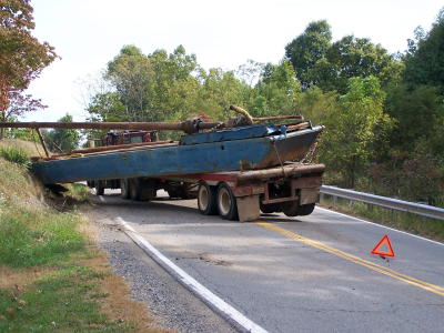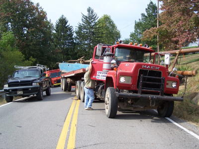 ![]() A truck hauling heavy drilling rig equipment lost its' load in a sharp curve on the Mt. Zion ridge shortly before noon yesterday. The equipment belonging to Creston Oil slipped from the truck landing against the pavement and in a hillside yard. No one was injured. Traffic was bottlenecked on Rt. 16, with the Grantsville Volunteer Fire Department on the scene about three hours.