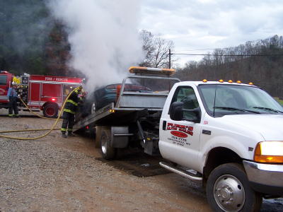 AVFD fireman Ryan Shartiger quickly puts out blaze Following a wrecker-car collision yesterday on Rt. 16 south of Chloe, Furr's Wrecker Service dispatched three wreckers to the scene, transporting the wrecked vehicles back to Grantsville. Following the collision, the vehicles caught on fire. Owners of the service, Tom and Dick Ullum, had a problem while transporting the car down the West Fork near Arnoldsburg. The car re-ignited on the back of a flat-bed wrecker, and a call was made to the Arnoldsburg VFD for assistance. Firemen quickly extinguished the blaze. See additional story Four Sent To Hospital
