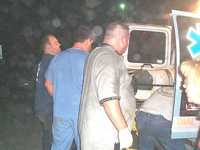 Road and Route 5, west of Big Bend. The driver, identified as Justin Whited, was trapped and had to be extracted from the vehicle by the Jaws and Life, and by members of the Grantsville Volunteer Fire Department and EMS workers. He and a 14-year-old female passenger were taken to Minnie Hamilton Health Care Center for treatment. A source at the scene said "They do not appear to be critically injured," but the nature of their injuries could not be confirmed. At least two firemen were treated on the scene for exhaustion, after working feverishly over the steep hillside. Fireman Curt Garretson was administered oxygen. Rescue workers were on scene for nearly two hours.