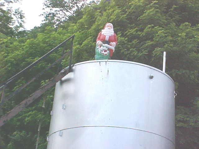 ![]() The Enron Claus has arrived in Sunny Cal with a message of cheer and hope. "Ho, ho, ho, have faith you little oil guys and investors, someone up there will make it right and we'll all get rich together. Trust me and believe in the ole Enron Claus." Actually someone put the plastic Claus on an oil tank at the mouth of Leafbank. |