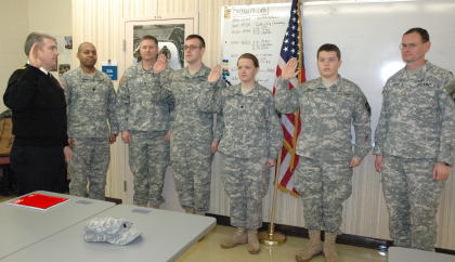 The GSC ROTC cadets recently took their oath at a 'Contracting Glenville, WV - Three Glenville State College ROTC cadets signed on the dotted line during a 'Contracting' ceremony held on campus on Thursday, January 24th. Cadets Autumn Bloom, Vincent Nolte, and Clinton Carr took their military oath and committed themselves to six years of service with the U.S. Army. Upon graduation from GSC, they will be commissioned officers and serve with the active Army, National Guard, or Army Reserves. In exchange for their commitment, they will receive academic financial assistance and a monthly stipend of up to $500 in addition to their ROTC training. As commissioned officers, their starting salary will be at least $45,300 annually. Professor of Military Science at West Virginia State University and Yellow Jacket Battalion Commander Lieutenant Colonel Tony Taylor officiated over the 'Contracting' ceremony. He was joined by GSC Assistant Professor of Military Science Major Charles Beirne and GSC Senior Military Instructor Sergeant First Class Daniel Webb. Autumn Bloom is a junior Psychology major from Glenville (Gilmer County), West Virginia. "I joined the ROTC program because I think it will help me become a better person and give me direction in life," she said. Bloom plans on making a career in the Army and hopes to work in the engineering field. She is the daughter of David and April Marks of Glenville. Clinton Carr of Point Pleasant (Mason County), West Virginia is a sophomore majoring in Natural Resource Management with a concentration in Environmental Science. "I want to be a leader so I joined the ROTC program because I think that it can help me reach my goal," said Carr. He is the son of Francis and Sharon Carr of Gallipolis Ferry. Vincent Nolte is a sophomore Biology major from Buckhannon (Upshur County), West Virginia. His oath was administered by his father James who hass served twenty years with the U.S. Army and now serves with the U.S. Public Health Service. "I will be the third generation of military service in my family. In addition to my dad, my grandfather was an Army JAG. I want to follow in their footsteps and use the examples they set to lead my life," said Nolte. The Glenville State College ROTC program was reinstated in 2010 after a ten-year hiatus. In less than three years, the program has grown to be the largest in the Yellow Jacket Battalion. The battalion includes ROTC programs at West Virginia State University, the University of Charleston, West Virginia University-Tech, and Glenville. There are currently sixty cadets in the battalion and thirty-eight of those are cadets from GSC. Glenville State College is the only college in Central West Virginia that offers ROTC training. "We are extremely happy with the growth of the ROTC program at Glenville State College. The program now has three permanent instructors. With the addition of cadets Bloom, Nolte, and Carr there are twelve contracted cadets in the GSC ROTC program. We are pleased with the progress the GSC program has made," said Lieutenant Colonel Tony Taylor. Interested persons are encouraged to contact the GSC ROTC office at (304)462-6285.