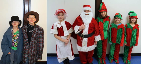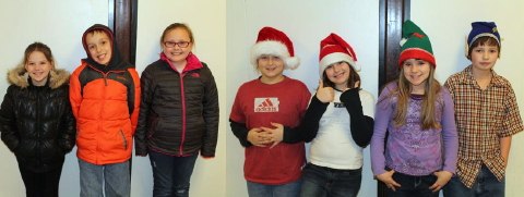 (L-R ) Mason Siwicki, Colby Lamb, Ella Hess, Kiley Pleasant Hill students presented their annual Christmas program on December 12th and 13th to an over-flowing audience of parents and families. "Jingle all the Way" told the story of Santa losing his jingle but all of the audience helped bring the jingle back and save Christmas. Each grade level performed a musical number between each scene of the play.