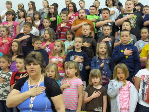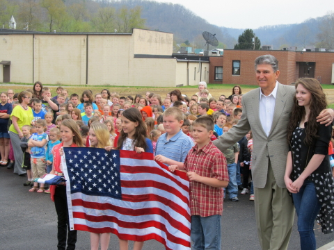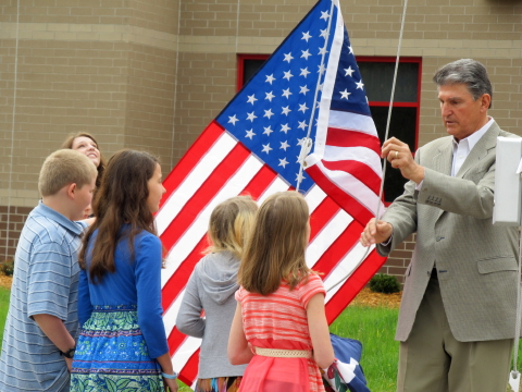 Old Glory and state flag goes up the pole US Senator Joe Manchin brought a flag flown over the US Capitol to be used at the new Arnoldsburg Elementary School. The senator gave a history lesson about the US and WV flag, the WV flag was donated by Delegate David Walker, and Manchin encouraged students to get an education. "Government and the people provide great new buildings like the Arnoldsburg school, but you must decide about the importance of learning, you're the important person here," Manchin said. Manchin was welcomed by Arnoldsburg principal Jeannie Bennett and introduced by acting superintendent Dan Metz. He took numerous questions from Arnoldsburg students who asked about Washington DC, being a US Senator, and how many guards are at the US Capitol. Fourth grade student Abigail White led the Pledge. A number of local officials attended the event, including Circuit Clerk Shelia Garretson, County Clerk Jean Simers, Assessor Jason Nettles, Sheriff Carl Ballengee, Commissioner Chip Westfall and Grantsville Mayor Curt Garretson.