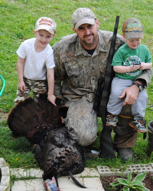 Joe Helmick killed this 23 1/2 pound turkey with a 9 1/2 inch beard and 1 inch spurs Monday on Nicut. Pictured with him are two of his boys, Hoyt and Cyrus