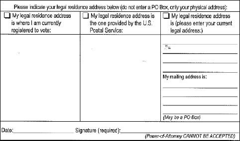 | Postcards have been mailed from the County Clerk's office to update voter information. If you receive the postcard, please update and return the postage-paid postcard. West Virginia Code requires that voters' addresses be cross referenced with the National Change of Address Database. Postcards were also mailed to any voter that has not updated their record (new 911 address, etc.) or have not voted in the last four years. See sample card below. If you have any questions, please call the County Clerk's office at (304) 354-6725.