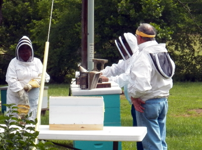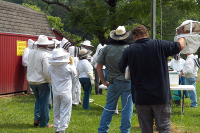 By Sharon Christ The West Central Beekeepers Association [WCBA] meeting of June 28 was hosted by Larry and Marianne Siers of Elizabeth. Dale Cunningham, President, was on hand to provide updates on the status of pending grant applications, as well as demonstrate the use of new electronic equipment and educational materials which have been purchased through funds provided by a recent grant approval of Our Communities Foundation in Parkersburg. This equipment and video materials will be used in conjunction with teaching of future classes and demonstrations, as well as outreach programs to local schools. Wade Stiltner, West Virginia Bee Inspector, demonstrated a live hive inspection, as well as how to split a hive. The split from that hive was donated as a door prize from Marianne and Larry, who also donated an additional hive, as well as some hand crafted items which were created from locally grown WV woods, such as Black Walnut, Cherry and Oak. After the demonstrations and business of the day, a picnic lunch was enjoyed by all who attended. The next WCBA meeting will be returned to its usual location of the Roane County Committee on Aging building in Spencer.