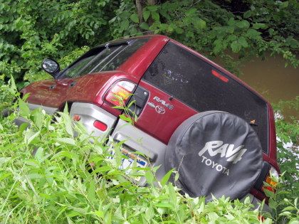 VEHICLE CRASHES TRASH BIN, GOES OVER EMBANKMENT ON RT 16 NEAR ORMA |