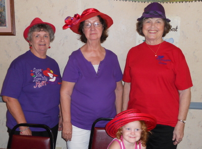(L-R) Yvonne Church, Juanita Boggs-Saunders, The Glamour Girls, local chapter of the Red Hat Society, met Wednesday, August 20th at the "Y" Restaurant in Arnoldsburg for a nice luncheon. The group decided on taking a train ride in September, so information on that trip is being checked out. There were two birthdays in August, Gae Bailey, and Lorraine Bailey. The gals had several guests who joined them for lunch. The young girl pictured in the front row is Juanita Boggs-Saunders' granddaughter, Lindsey Cottrill. Missing from the picture is Maureen Donato, who took the picture. |