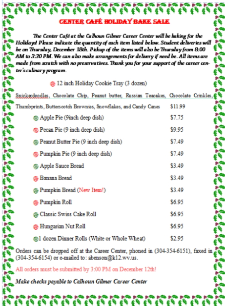 ![]() The Culinary Arts program at the Calhoun-Gilmer Career Center is holding its 7th Annual Gingerbread House Event. The public is invited to the Career Center to admire the gingerbread houses and the student's efforts this holiday season. In addition to the gingerbread houses, the Culinary Arts program is holding their Annual Center Café Bake Sale. If you are interested in ordering, please see the order form Below and call the Career Center at 304-354-5161 to place an order.