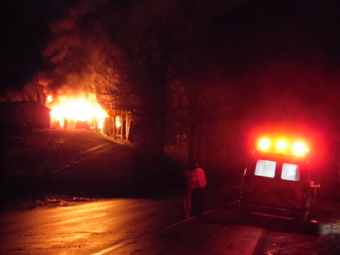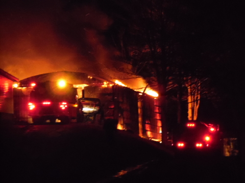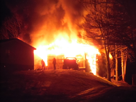 Fire destroyed a large metal garage on the Mt. Zion Ridge at 9292 So. Calhoun Highway Tuesday night. The structure was reportedly adjacent the Curtis Lemon residence, which was endangered, but not damaged. A propane tank was near the garage. Minor explosions erupted as the fire ventilated. The Grantsville, Arnoldsburg and Upper West Fork Departments responded to the scene with Minnie Hamilton EMS just before 11 p.m. No injuries were reported.