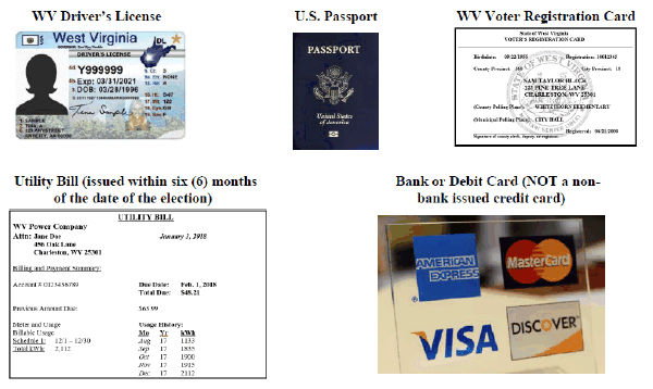 Acceptable Forms of Non-Photo Identification. ⢠Voter registration Card ⢠Medicare card or Social Security Card ⢠Birth certificate ⢠WV hunting or fishing license ⢠WV SNAP ID card ⢠WV TANF program ID card ⢠WV Medicaid ID card ⢠Bank or debit card ⢠Utility bill or bank statement issued within six months of the date of the election. ⢠Health Insurance card issued to the voter Acceptable Forms of Photo Identification. ⢠WV drivers license or other WV ID card issued by the DMV ⢠WV Voter Identification Card ⢠Drivers license issued by another state ⢠U.S. passport or pass- port card ⢠Military ID card issued by the U.S. ⢠U.S. or WV Government employee ID card ⢠Student ID card ⢠A concealed carry (pistol/revolver) permit *Beginning January 1, 2018, voters must show a valid form of identification to vote in-person during an Early Voting period or on Election Day in any federal, state, municipal or special election. For more information, please see W. Va. Code § 3-1-34 or visit the Secretary of Stateâs website at sos.wv.gov Acceptable Forms of Photo Identification. ⢠Voter registration Card ⢠WV drivees license or other WV ID ⢠Medicare card or Social Security Card card issued by the DMV ⢠Birth certificate ⢠WV Voter Identification Card ⢠WV hunting or fishing license ⢠Drivees license issued by another ⢠WV SNAP ID card state ⢠WV TANF program ID card ⢠U.S. passport or passport card ⢠WV Medicaid ID card ⢠Military ID card issued by the U.S. ⢠Bank or debit card ⢠1.1c.,S. odr WV Government employee ⢠Utility bill or bank statement issued within six months of the date of the election. ⢠SI tudent ID card ⢠Health Insurance card issued to the voter ⢠A concealed carry (pistol/revolver) permit |