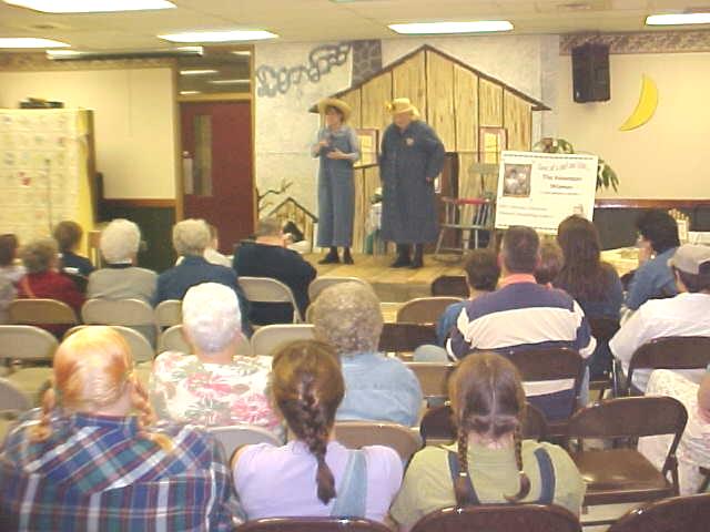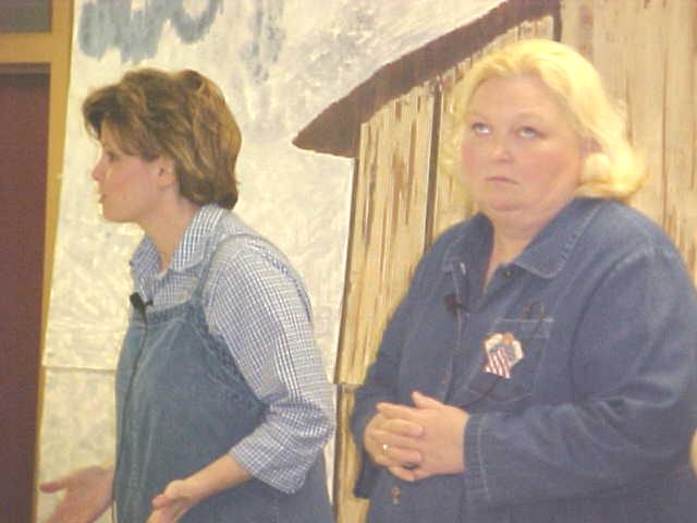 "Well, lookie here, youngins...we got company! Come on in, take your shoes off and set a spell. We're the Mountain Women and we're just brimmin' with homespun tales 'specially fer you..." Suzi "Mama" Whaples and Carrie Newman welcomed visitors to the Calhoun-Gilmer Career Center yesterday to spin a few mountain stories, often bringing laughs and sometimes bringing tears. An audience member said "I've haven't laughed so hard since I went to see Bill Cosby." The "Mountain Women" are professional storytellers and humorists from West Virginia, and they shared their talents with visitors at the annual open house "Spring Fling" at the center. The women are national award winning artists, who weave storytelling from a tapestry of Appalachian experience, having appeared in performances in more than a dozen states. The duo also facilitates workshops for writers, storytellers and performers. They have more than 30 years experience in working with children and adults. Combined with their love of people is their love for mountain heritage. The event was sponsored by Lights On!