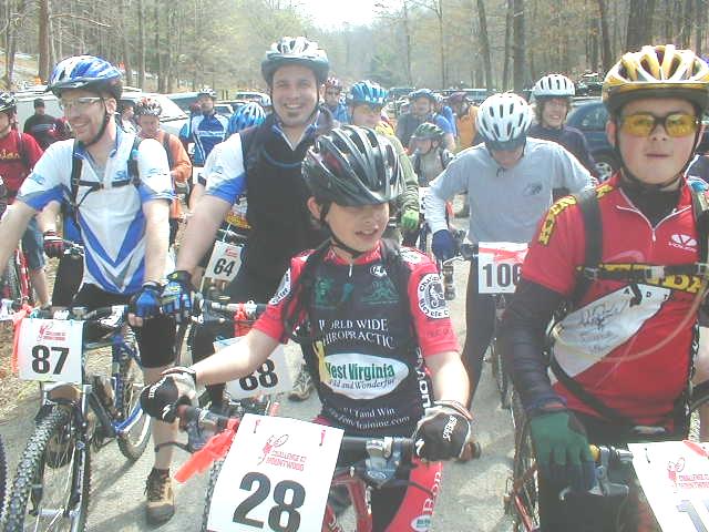 | Submitted by Diann Clothier The WV Mountain Bike Racing Team hit the trails Sunday at Mountwood Park in Waverly, WV, for the 2nd WV Mountain Bike Association Point Series Race of 2003. The WV Mountain Bike Racing Team is sponsored by WV Tourism, Worldwide Chiropractic, rock star Jon Bon Jovi, the Charleston Bike Shop, and Cannondale. Mandy Riddle, racing in the Women's Expert Class, and Mark Johnson, racing in the Men's Sport 26-35 Class, both took first place. Clay Evans, Men's Pro/Expert Class, placed 2nd, and Brian Fawley, Men's Junior Expert Class, placed 4th, along with team manager, Steve Thaxton, racing Pro/Expert Vet. The Pro/Expert classes races a course of 28 miles. Sport riders had to complete a 16 mile race, and the Masters and Juniors raced 8 miles. Linda Brison, Women's Master Class, took 1st place, and Courtney Dudley placed 3rd in the Women's Sport Class. Will Clagg placed 4th in the Men's Sport 19-25, but the team's littlest member, Cai Clothier (Junior 14 and under) did not finish the 8 mile cross country race, but did place 1st in the Kids' Race for the 11&12 year old group. Come Watch the WV Mountain Bike Racing Team compete next Sunday at Big Bear, near Hazelton WV!