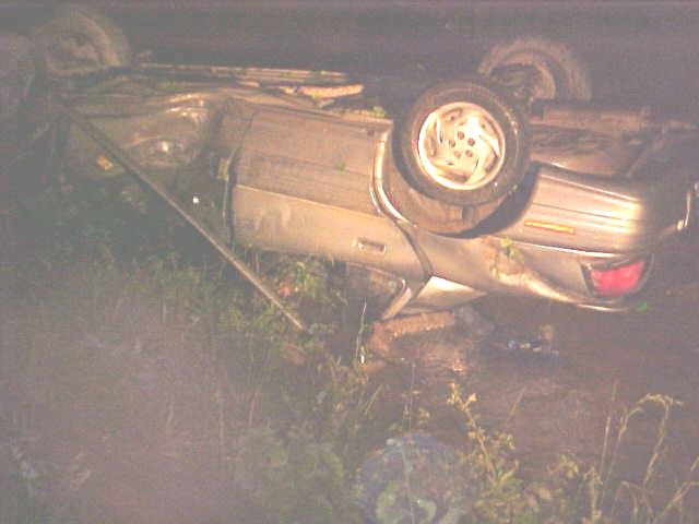 Strikes end of guardrail, flips in creek A car struck the end of a guardrail and flipped into a deep stream bed, landing on its top, early Tuesday morning on Route 16 at the mouth of Stinson Creek. The highway was wet after an early morning drizzle. The guardrail was bent forward by the impact and heavily damaged. The 1995 Pontiac owned by Roscoe Rogers of Chloe appeared to be a total loss. The driver of the vehicle and a passenger were not transported by Calhoun EMS. EMS and the Upper West Fork VFD responded to the call at 4:30 a.m. near Stinson Grocery. Deputy Sheriff Carl Ballengee also responded.